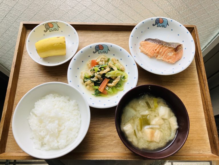 ・ご飯・鮭の幽庵焼き・青梗菜の炒め煮・味噌汁・バナナ
