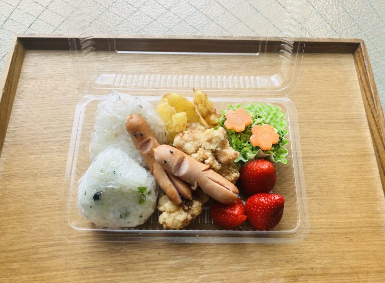・二色おにぎり・鶏の唐揚げ・ウィンナー星人・フライドポテト・ブロッコリー・いちご