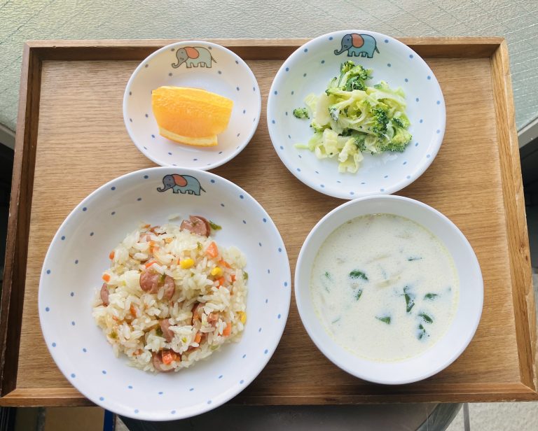 ・カラフルピラフ・キャベツのサラダ・ミルクスープ ・オレンジ