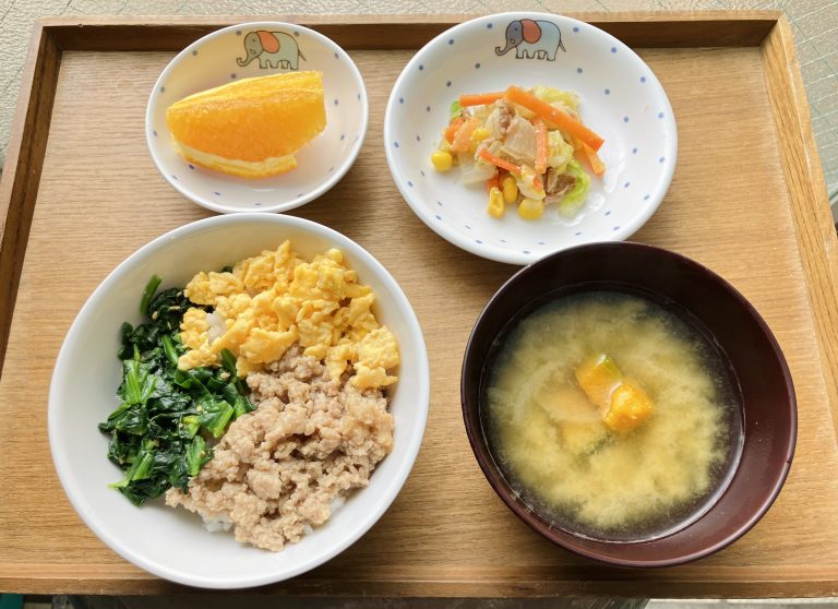 ・三色丼・白菜のツナサラダ・味噌汁・オレンジ